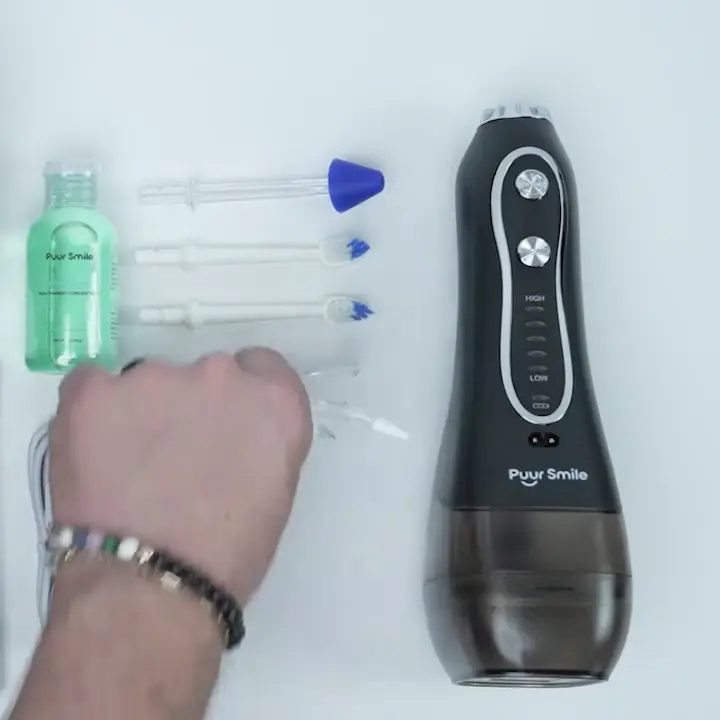 Puur Smile also has these incredible FlossDrops that infuse with the tank water, so when you blast water in between your teeth, it now also kills the bacteria in between your teeth.